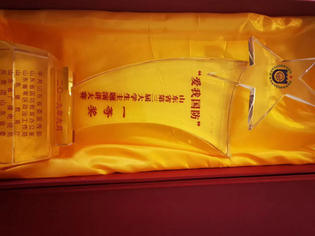 9月19日下午,由中共山东省委宣传部、省国防教育办公室、省军区政治工作局、省教育厅、省广播电视局、共青团省委联合主办的第三届“爱我国防”山东省老员工主题演讲大赛总决赛在山东教育电视台1000平米演播大厅圆满落幕,公司2016级机械工程专业员工王皓荣获一等奖,并获得代表山东省参加全国比赛的资格。